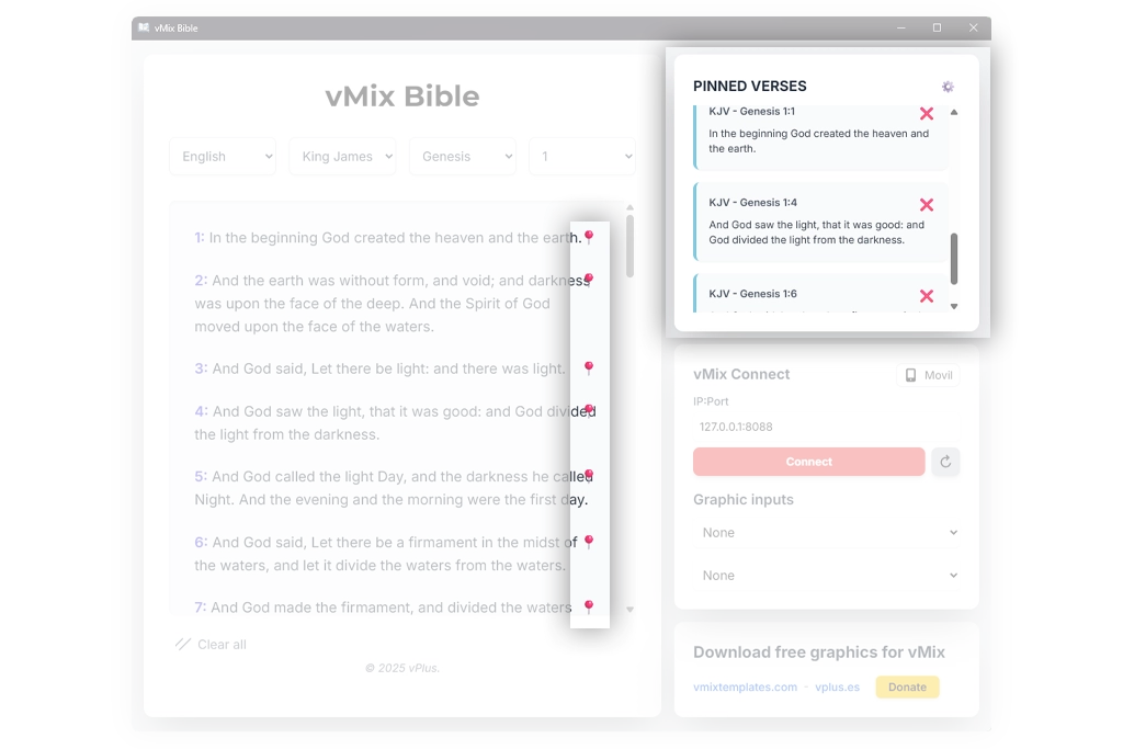 Prepare all the verses you'll need before your event begins. With our pinning feature, you can create an organized list and have everything ready to send to vMix at the exact moment, eliminating last-minute stress and mistakes.