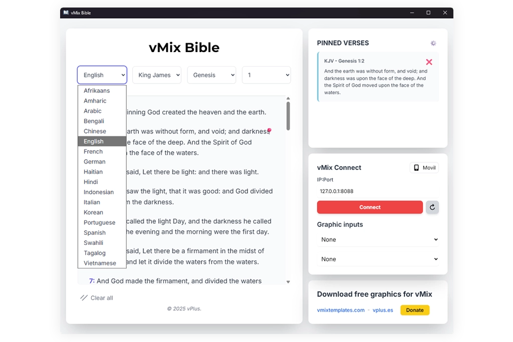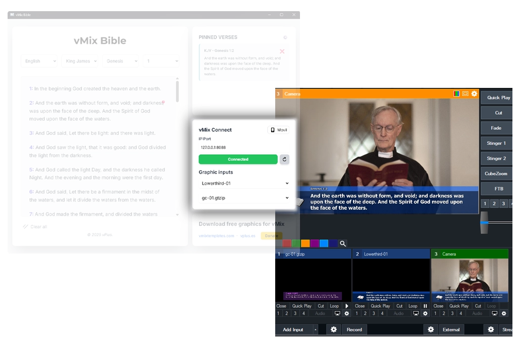 vMix Bible helps you prepare and project Bible passages during your live stream, without the need for heavy, resource-intensive software. It connects to vMix via its API to automatically detect your GT titles and display verses on screen. You can also control it from your phone on the same network.